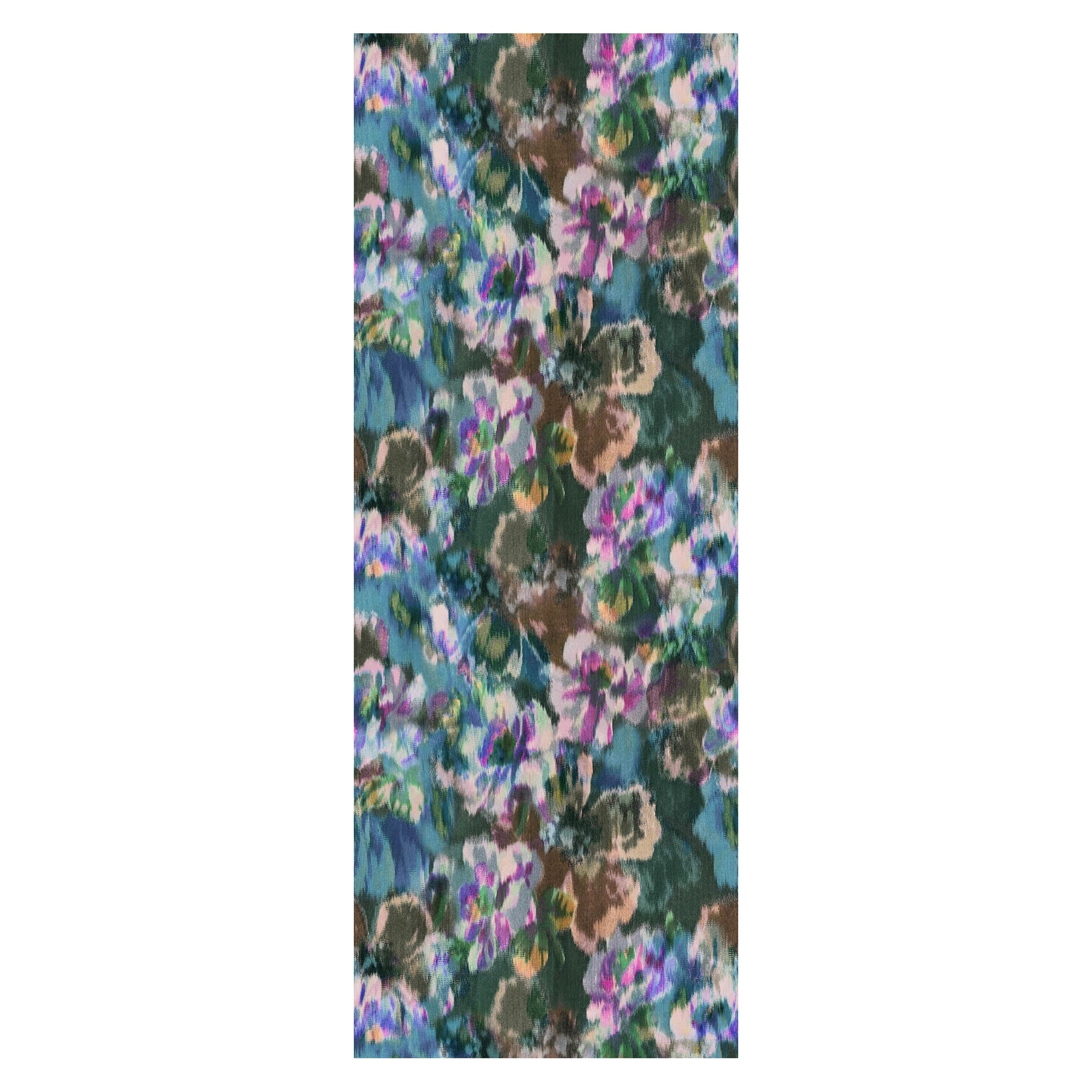 Digitally printed Edith scarf looks like an impressionist painting. Soft lavender, pink and green hues are printed on a dark ground of 90% fine wool/10% silk. Lightweight, breathable, and warm.