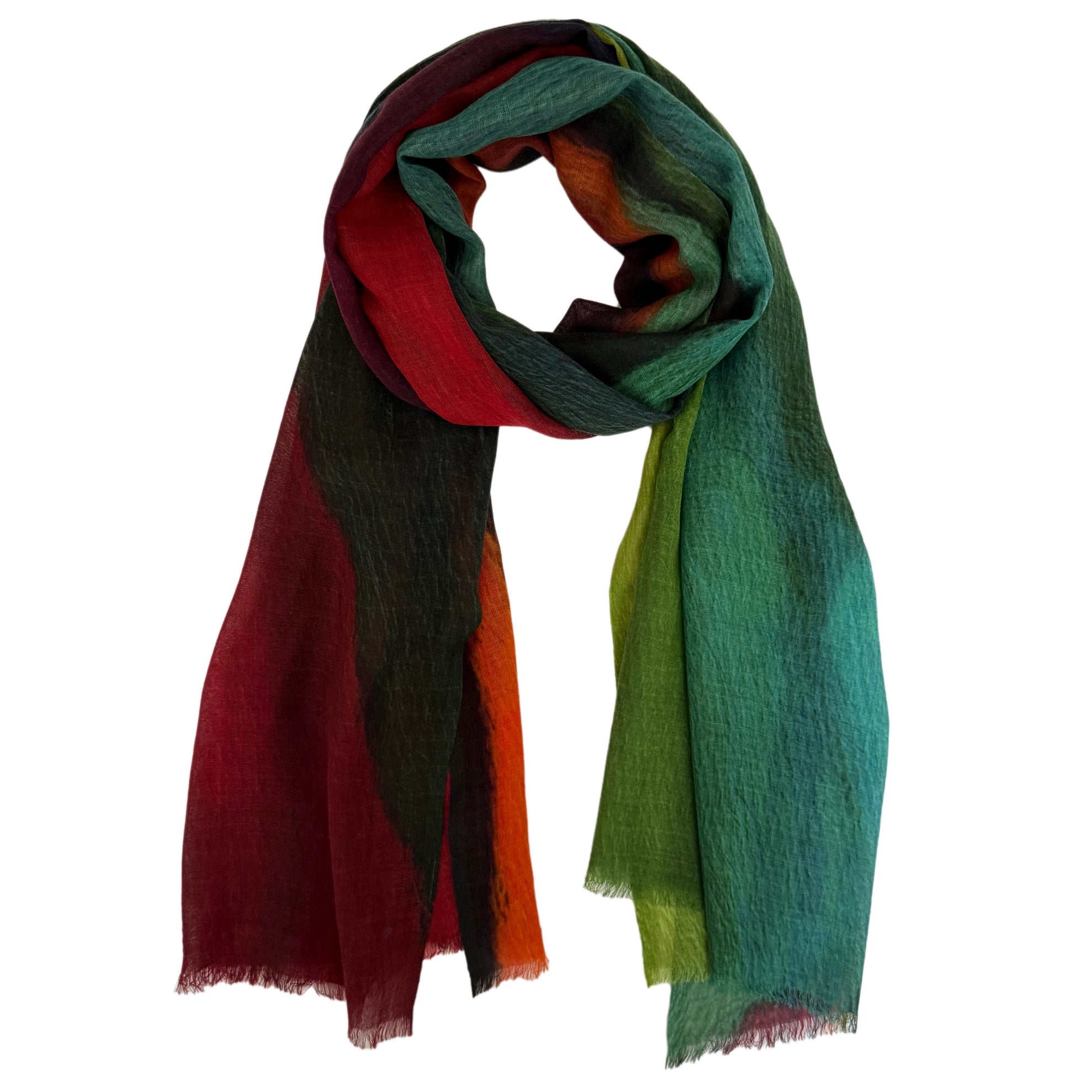 Dynamic washes of color in aqua, green, red and black make a dramatic statement. 90% wool/10% silk blend is lightweight, warm and breathable.