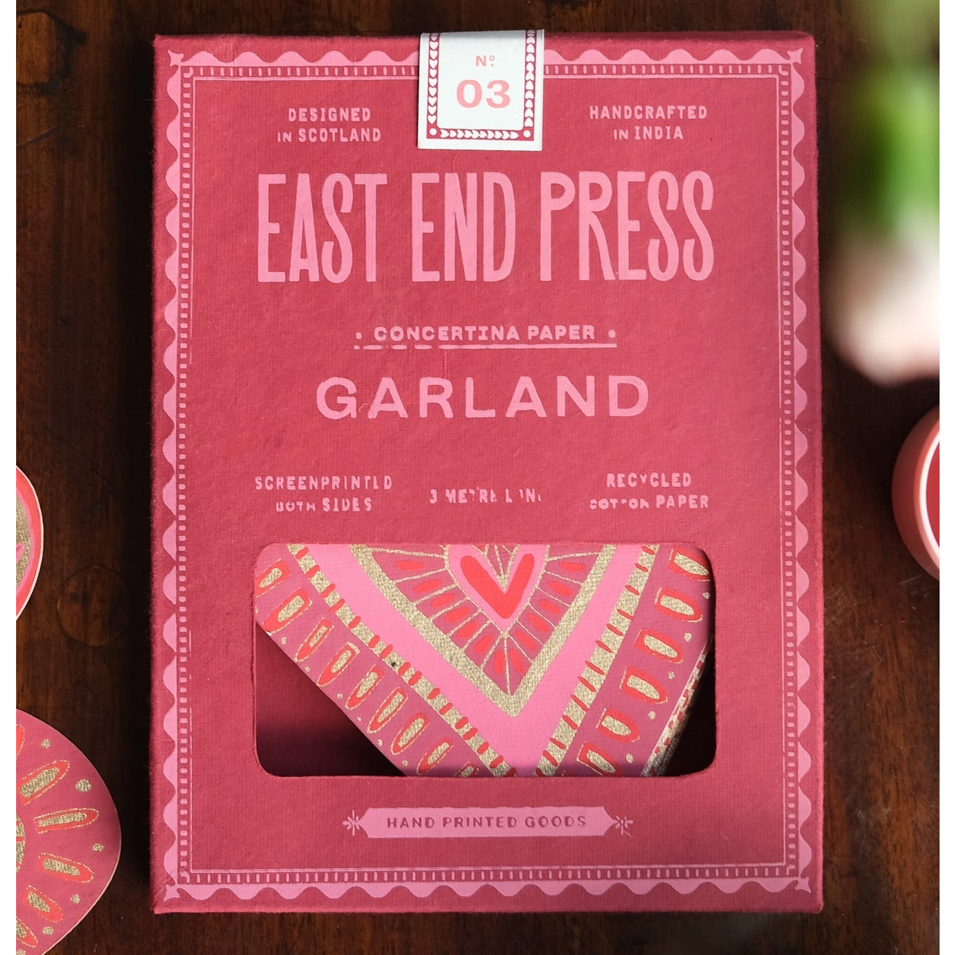 Love is in the air with our sweet collection of hearts, each adorned with bursts of pastel pink, ruby red, and flourishes of metallic gold. This concertina folded garland is made from entirely recycled content paper. 4 designs repeat over 20 shapes. Screen printed by hand on both sides by talented artisans in Jaipur. Sustainably made from recycled materials.