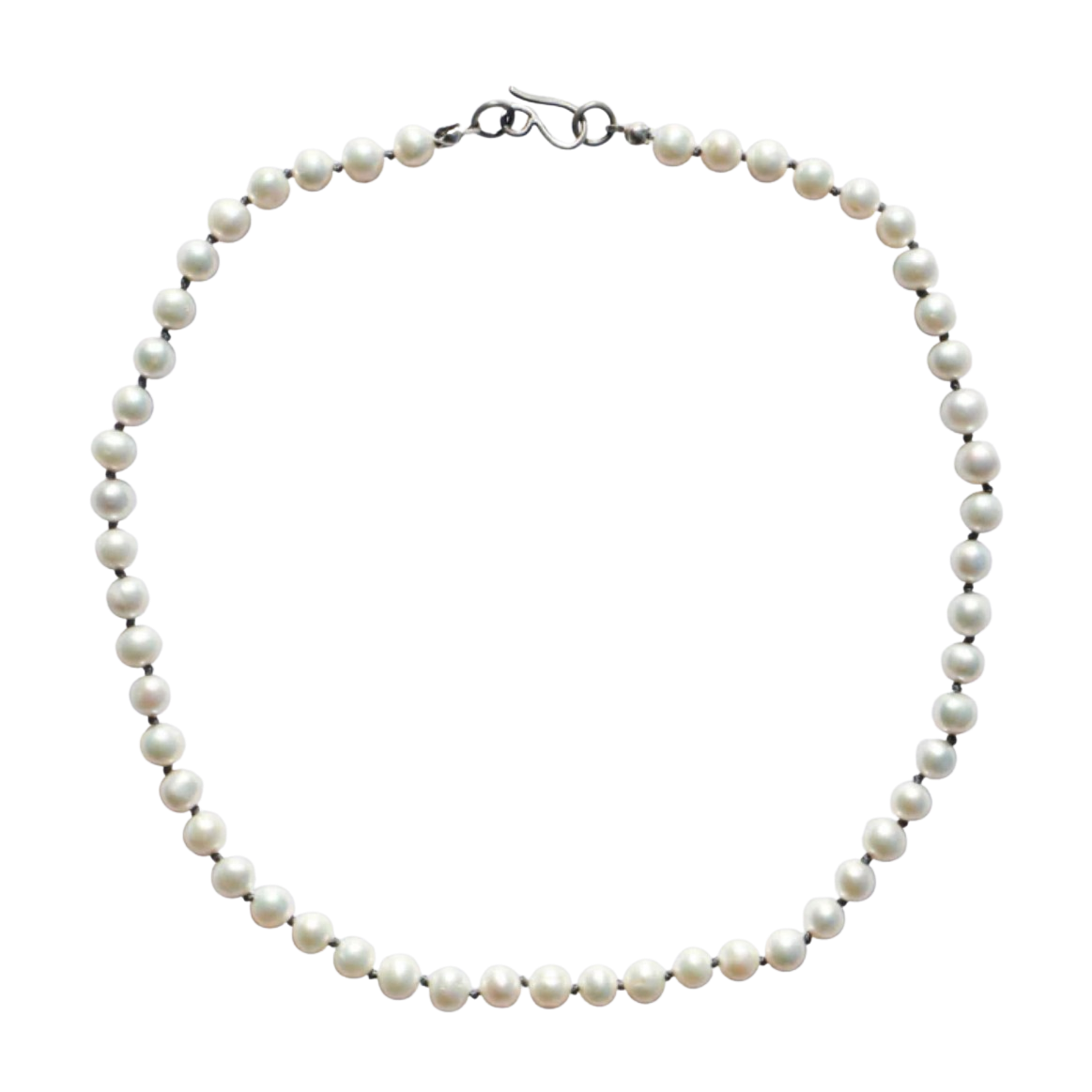 A strand of white pearls, hand-knotted with dark grey silk cord, creating a chic twist on a classic. By Jane Diaz.